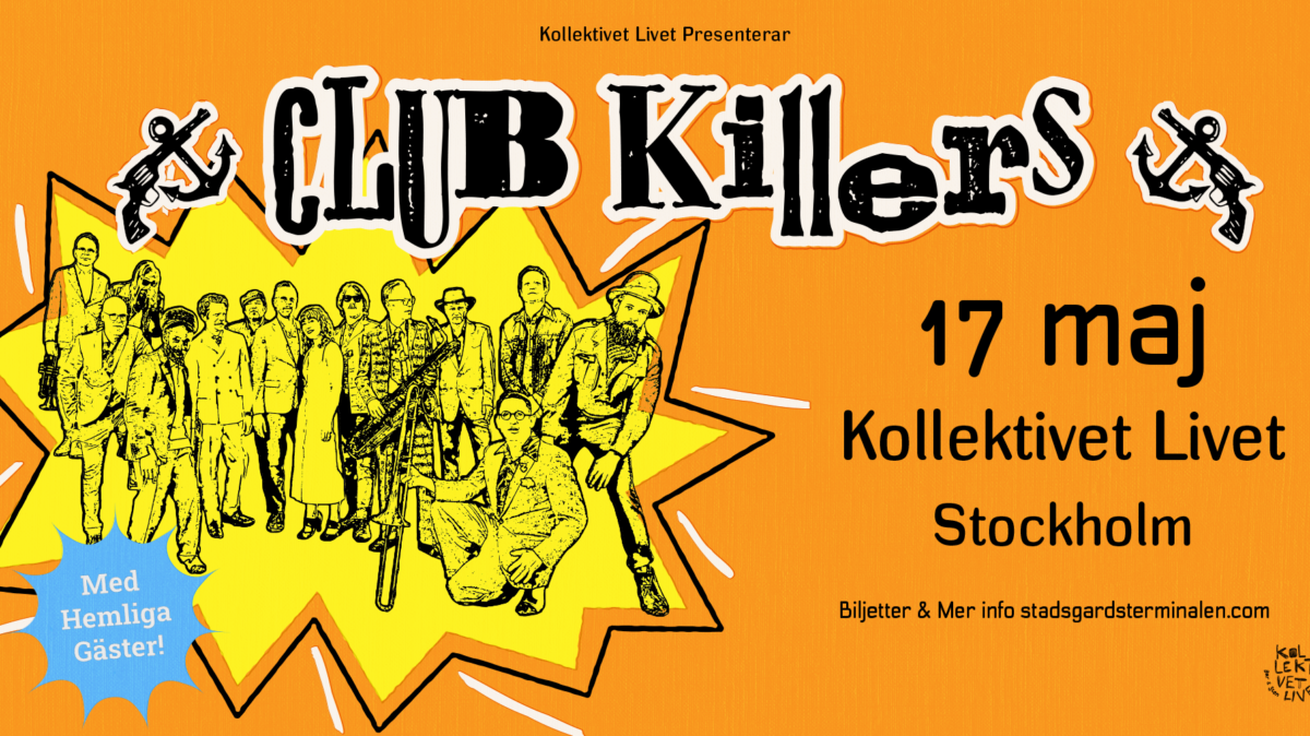 CLUB KILLERS – En helkväll med Sveriges svängigaste ska- och jazzorkester lördagen den 17 maj 2025 på Kollektivet Livet Bar & Scen. Partybandet och 15-mannaorkestern Club Killers har varit ett odödligt inslag på Stockholms kulturscen sedan 2002. Orkesterns mäktiga sound grundar sig i ska, rocksteady, reggae, jazz och soul. Samtidigt som de är ett band av ytterligheter är de ett band med en tydlig själ – live bjuder de på värme, rytmer, färger, sväng, kärlek, kaos, lite politik och som vanligt hemliga gäster.